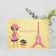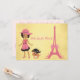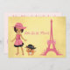 This Paris theme birthday invitation featuring a gold parchment background on front with an African American girl, fancy cat, and Eiffel Tower depicted in pink and white polka dots. "Ooh la la Paris" is written in fancy pink font. The back of the invitation has soft pink background with darker pink font. Purchase yours today!