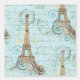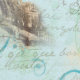 A vintage sepia image of the Eiffel Tower from the Paris exposition in the 1800s appears with a vintage Paris handwritten address and postmarks and text from Victor Hugo's Notre Dame du Paris on a background with faint branches and leaves in aqua, to make this lovely French themed wallpaper.