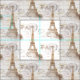A vintage sepia image of the Eiffel Tower from the Paris exposition in the 1800s appears with a vintage Paris handwritten address and postmarks and text from Victor Hugo's Notre Dame du Paris on a background with faint branches and leaves in pink and cream. Matching items and many other vintage Paris designs are available in my Zazzle store.