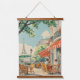 A charming vintage-style illustration of a sunny Paris café terrace with rattan chairs, red-striped awnings, and views of the Eiffel Tower. The 1950s retro aesthetic and warm ambiance make it a perfect piece for nostalgic or travel-themed decor.