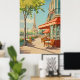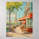 A charming Paris street café with rattan chairs and red awnings, set against a clear blue sky and a stunning view of the Eiffel Tower. Lush greenery and blooming flowers complete this idyllic scene, perfect for lovers of vintage travel art.
