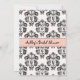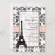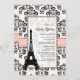 Pretty and sophisticated Parisian style bridal shower invitations with a black and white damask floral border, printed pink ribbon look design and the Eiffel Tower on it. Designed by Chrissy H. Studios, LLC. All Rights Reserved.