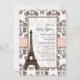 Pretty and sophisticated Parisian style bridal shower invitations with a dark brown damask border, pink ribbon look design and the Eiffel Tower on it. Designed by Chrissy H. Studios, LLC. All Rights Reserved.