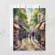 A bustling Parisian street scene with the Eiffel Tower in the background. People stroll along the sidewalk, past shops and cafes, enjoying a sunny day.
