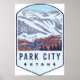 A vintage ski badge design of Park City east of Salt Lake City with the Wasatch Range part of the Wasatch Back in the Rocky Mountains in Utah, United States.