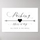 Simple Elegant Calligraphy Script Wedding Parking This way Arrow pointing Left directional Sign, in beautiful flowing fancy letters and your personalised names. A stylish yet simple formal design in black and white or any background colour you choose. Just click the customise further link, shown under the text personalisation area on the right, and choose your custom colour background. This sign poster template makes it fast and easy to create stunning additions to your wedding decor. Signs can be enlarged, there are many sizes to choose from, as well as options for custom framing and matting. Wedding this way custom signage.