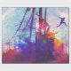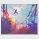 A colourful artist's impression of parkour being practiced in an urban back street.