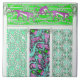 An interesting and unique print from an old world tile. Featuring baboons, skulls parrots, decorative prints and vine covered pillars. In colours of green purple, pink, turquoise, black and white. Interesting and unique.