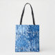 Tote bag in an Illustration based on Walter Crane's 'Macaw' pattern for William Morris studios. A macaw / wild parrot in an exotic jungle setting - digitally enhanced and coloured in indigo blue and white