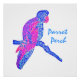 Vivid, graphic drawing, of a Tropical parrot, perched on a branch-and displayed in, an exotic, island pattern, in fuschia, red, turquoise, blue, yellow, white, and black.