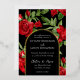 Floral arrangement sits behind the wedding ceremony details enclosed by an arch for this lovely red flowers invitation. The double arch is in real foil (gold, silver, or rose gold). The back of the invite is a small floral arrangement above the wedding date in white text on a black background.