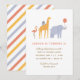 Calling all party animals! Celebrate your little one's birthday with this colourful invitation, featuring a party-going flamingo, giraffe and elephant and a bold stripe pattern on the back.