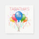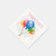 Balloons – © Sunny Mars Designs. Cute, fun, girly custom printed 21st birthday party pack of 50 folded 3 ply paper napkins with assorted coloured balloons, ribbons or streamers, confetti stars and spirals in yellow, green, pink, blue and orange, against white background. Personalise it by changing the name and age number to your own.