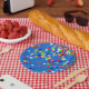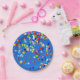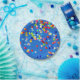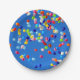 Festive party plates decorated with colorful party balloons floating in a bright blue sky.