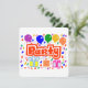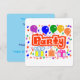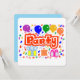 A Horizontal, Flat Greeting card, =optional, with Round Corners=optional, with a Drawing/Design, of the Word= Party, in the Colour Red, and White, With Some Colourful Balloons, Confetti, and Gift packages. = (Drawing/Design by P.J.M.) on the front.