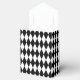 Party favour box shown in a black and white diamond pattern design.