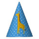 A cool blue with white polka dotted party hat features a party loving giraffe and is a fun addition to any kid's safari themed birthday celebration.