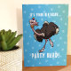 A greeting card featuring a shaggy ostrich having a birthday boogie, complete with rainbow striped party hat and polka dotted blower. Default text reads: "IT'S YOUR BIRTHDAY... PARTY HARD!" Change to an alternative message or caption if preferred.