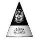 This party hat is shown in a Halloween spooky skull print.