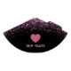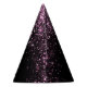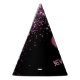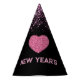 This party hat is shown with a fun pink faux glitter heart print, pink glitter print cascading from top and on sides. Text of New Years in coordinating pink, all on black background.