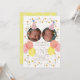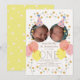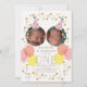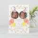 This cute twin girls' 1st/first birthday party invitation features your photo with a pair of party hats in pink and balloons in pink and yellow. The reverse side features a light yellow background with random triangle and star patterns. Personalise for your needs. You can find more matching products at my store.
