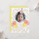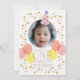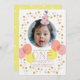 This cute 1st/first birthday party invitation features your photo with a party hat in pink and balloons in pink and yellow. The reverse side features a light yellow background with random triangle and star patterns. Personalise for your needs. You can find more matching products at my store.