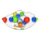 Happy Birthday. The text is written in orange with a black shadow. The background image is a graphic depiction of multiple bubbles in different sizes and varying colours (blue, green, white, yellow, red, orange).