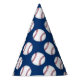 This is a fun hat to wear for a party. It features white baseballs on a blue background.