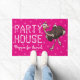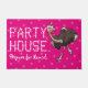 Welcome your party guests (or everyday guests) with this fun doormat. Featuring a shaggy ostrich having a boogie, complete with rainbow striped party hat and polka dotted blower. Change the default "PARTY HOUSE Prepare for dance!" text to your preferred message or caption.