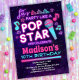 Let's sing, dance and party like a pop star with a music theme birthday party invitation for girls in pink and blue colours.