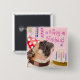 Fun button with a cute pug wearing a spotty party hat celebrating someone's birthday with candles, cake and streamers.