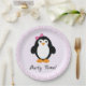 Party time! Cute cartoon girl penguin with pink floral background paper plate.