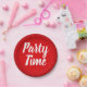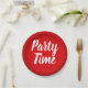 "Party Time" written in a brush lettering on a red sunburst background.