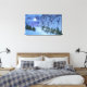 A 3D fantasy landscape full of shimmering snow and magical fairy lights. A row of silvery shining lamps lights the trail through a snowy mountain pass hemmed in by steep rocky cliffs. The sparkling snow-covered path is hemmed in by dark fir trees. On the far side of the cleft a translucent glowing fairy castle awaits the enchanted traveller on his journey to fairyland.