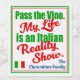 "Passa il Vino: La Mia Vita è uno Show della Realtà Italiano" Etichetta del Vino. Questa etichetta aggiunge un tocco di umorismo alla tavola della famiglia italiana. Con audaci lettere maiuscole verdi combinate con un divertente carattere rosso, emana un fascino leggero. Nell'angolo in basso a sinistra, troverete una piccola bandiera italiana, che aggiunge un tocco delizioso. Questa etichetta è un'ottima scelta per coloro con un senso dell'umorismo italiano ed è un regalo fantastico. È il perfetto complemento per la vostra tavola durante un vivace pranzo in famiglia italiana o una festa a tema italiano, creando l'atmosfera ideale per il divertimento e il buonumore.