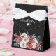 This floral premium wedding gift box with elegant white text with luxury red roses, bright dark green leaves and white roses on a simple black background.