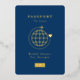 Passport to love with globe outline and aeroplane on the front; passport style layout on the back with subtle world map behind; photo too. Non foil versions also available in smaller sizes and editable colours.
