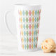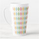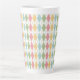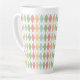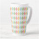 Modern and stylish latte mug has pastel coloured argyle diamond pattern on white background.