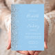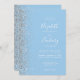 The left-hand edge of this elegant modern wedding invitation features a silver faux glitter design. The customisable text combines white handwriting, copperplate and italic fonts on a pastel baby blue background. The reverse side features a matching baby blue and silver glitter design.