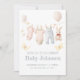 Celebrate the upcoming arrival of a little one with this adorable baby shower invitation featuring a soft pastel clothesline design. Delicately illustrated with baby essentials hanging on a line—tiny outfits, bibs, and blankets—this sweet watercolor-inspired card is perfect for parents-to-be who love a gentle, whimsical, and timeless baby shower theme.