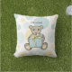 The product design features a teddy bear holding a present. This original animal toy cartoon with personalised text makes a cute and unique outdoor pillow for kids.