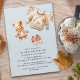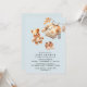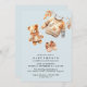 Cute autumn baby shower invitations with watercolor illustrations of a teddy bear and cosy baby clothes. Baby blue colour is ideal for a shower celebrating a baby boy.