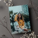 Simple pastel blue graduation party invitation featuring the graduate's vertical photo with "graduate" displayed in modern white lettering Personalise the photo. The invite reverses to display your graduation party details with a black background. Customise this design with your message and personalised information. All designs are printed.