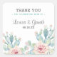 An elegant sticker thanking your guests at your wedding for celebrating your special day. Featuring pastel watercolor cacuts flowers on a classic white background with modern text of name and date that can easily be customised.