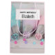 A birthday gift bag with a pretty pastel coloured photograph. Featuring cake decorating items in pastel blue, pink, peach and yellow. Set upon a wood table with little colourful beads. A white rectangle with a pink border layered over top with your personalised text inside.