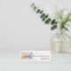 Mini business cards with a pretty pastel coloured photograph. Featuring cake decorating items in pastel blue, pink, peach and yellow. Set upon a wood table with little colourful beads. Text written on a pink watercolor background.
