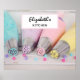 Poster with a pretty pastel coloured photograph. Featuring cake decorating items in pastel blue, pink, peach and yellow. Set upon a wood table with little colourful beads.