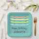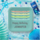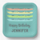 Make your party a splash with these personalised party plates. They feature illustrations of kayaks in pretty pastel colours of peachy coral, pale yellow, lime green and aqua blue set against a teal or turquoise blue background. These kayaking themed party supplies are ready to be personalised with your own greeting and name in charcoal grey coloured lettering.