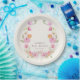 Embrace the beauty of spring with these lovely paper plates designed for( name) baby shower. A vibrant wreath of pink and coral blossoms encircles the center, symbolizing new beginnings and the joy of motherhood. The soft color palette and delicate floral arrangement make these plates a perfect choice for a whimsical and romantic baby shower theme. They are ideal for any celebration honoring a new baby, adding a touch of natural elegance to your event.