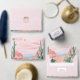 This return address features painted artwork of desert cactus in Mexican pots on a pink background with white text. Colors include green, pink, yellow, blue white and coral.